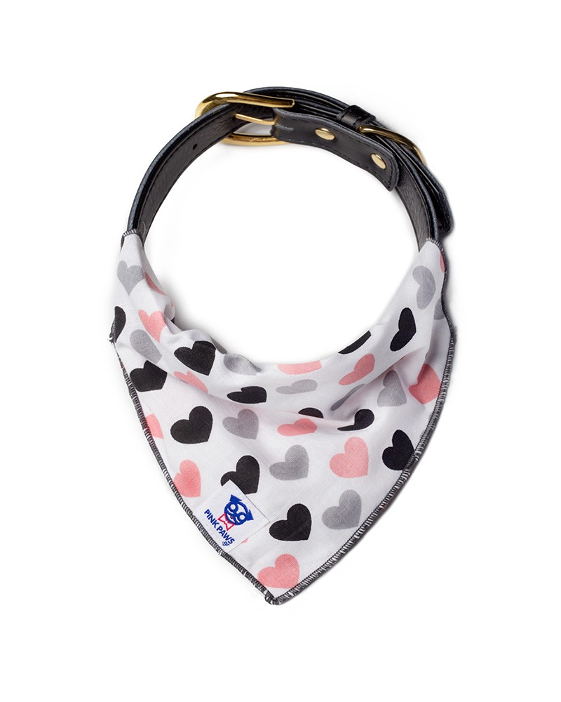 Μπαντάνα σκύλου με μαύρες, ροζ & γκρι καρδούλες συνδυασμένη με cow leather κολάρο σε μαύρο χρώμα προσφέρει μια κομψή εμφάνιση στο σκυλάκι σας!