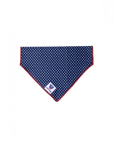 Η μπαντάνα σκύλου σε μπλε χρώμα με λευκό πουά και κόκκινες λεπτομέρειες στο τελείωμα προσφέρει ένα κλασικό και κομψό look στις καθημερινές βόλτες.